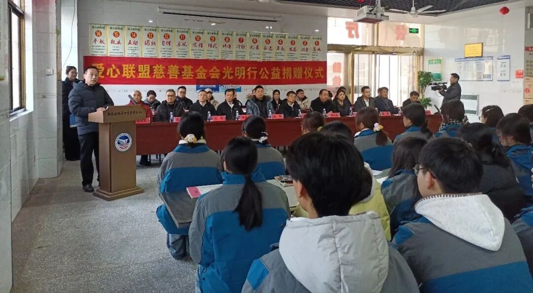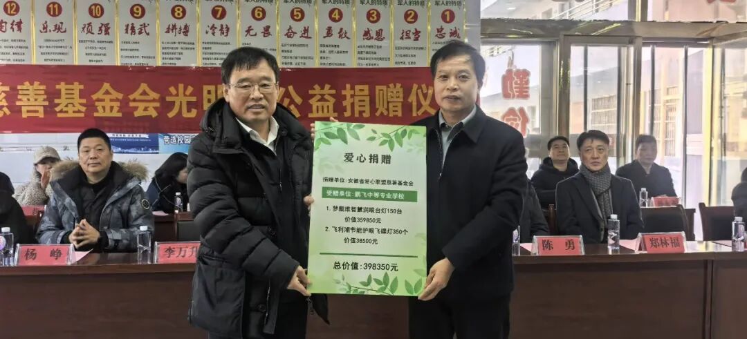 为深入贯彻落实习近平总书记关于儿童青少年近视防控工作的重要指示,12月25日上午,安徽省爱心联盟慈善基金会走进临泉县鹏飞中等专业学校,隆重举行第十五届(临泉县)“光明行”捐赠仪式。活动中,基金会共向学校捐赠梦戴维智慧润眼台灯150台及飞利浦节能护眼飞碟灯350个,捐赠总价值近40万元,以实际行动守护学子眼健康、点亮光明未来。